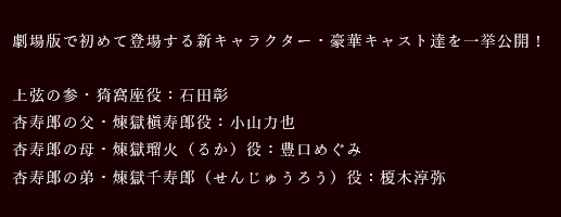 鬼滅の刃公式 新キャスト公開 劇場版 鬼滅の刃 無限列車編 にて初めて登場する新キャラクター キャストを公開 猗窩座 石田 彰 さん 煉 獄槇寿郎 小山力也 さん 煉 獄瑠火 豊口めぐみ さん 煉 獄千寿郎 榎木淳弥 さん 詳細はこちら